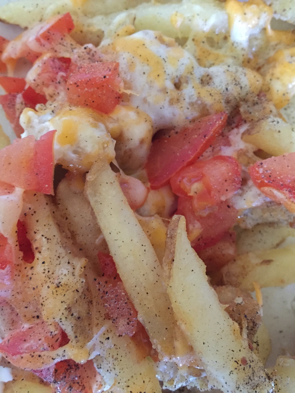 *Fries: McCain's Crispy French Fries, Cheese: Black Diamond Old Cheddar, Chicken: baked seasoned chicken breast, Tomatoes; on the vine. One serving is 409 calories, 15g fat, 400mg sodium, 27g carbs, 10g protein, 4% viatmin A, 10% calcium, 177mg protassium.*